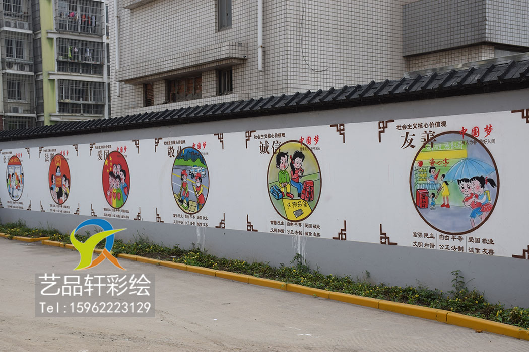 墙体彩绘是创意与实用的完美融合。在创作上墙体彩绘打破传统束缚,可根据围墙的尺寸、地形特点定制创意方案,卡通、3D、写实等多种风格自由切换,既能打造法制宣传围墙,也能营造古朴典雅的文化街区;在实用性上,彩绘涂料具备防水、防晒、耐擦洗的特性,能够长久保持色彩鲜亮,延长围墙的使用寿命。相较于传统的瓷砖粘贴、涂料粉刷,墙体彩绘更具灵活性与艺术性,成本可控、施工高效,是低成本、高效果的环境美化选择,广泛应用于乡村建设、校园改造、城市街区更新等多个领域。墙体彩绘正用创意与匠心重塑围墙之美。它让每一面围墙都成为展示形象的窗口、传递文化的载体、凝聚人心的纽带。随着产业的深入推进,墙体彩绘必将绽放更绚丽的光彩,绘就出更多充满活力、独具特色的美丽画卷,让围墙焕新彩,让生活添精彩,为城乡发展注入源源不断的美学动力与文化活力。